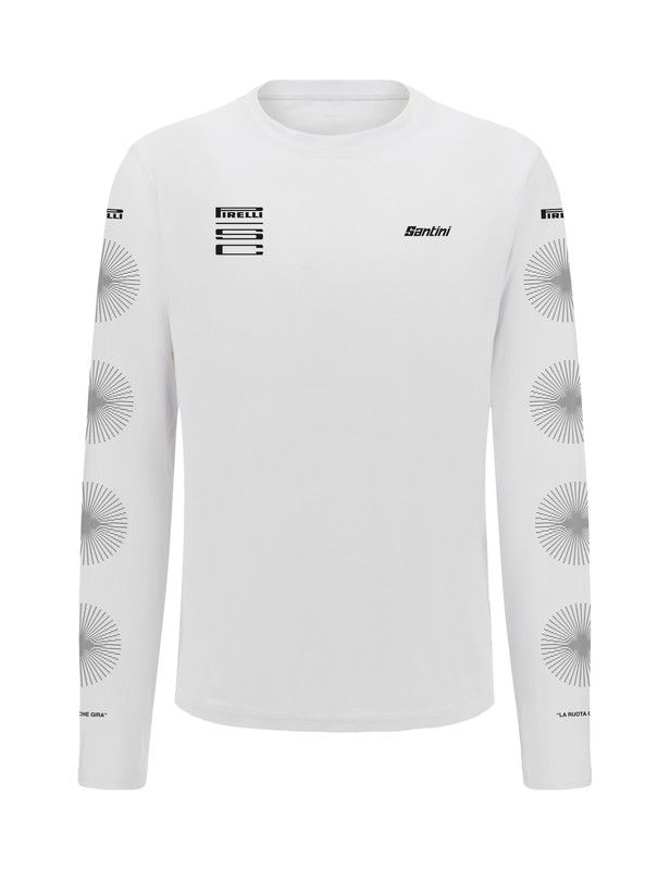 Camiseta de ciclismo Pirelli Rueda en blanco con detalles gráficos en gris. Diseño minimalista con estampado de ruedas en los brazos y logotipos de Pirelli y Santini. Fabricada en mezcla de poliéster y algodón, ideal para ciclistas que buscan estilo y comodidad. Perfecta para entrenamientos o uso casual.