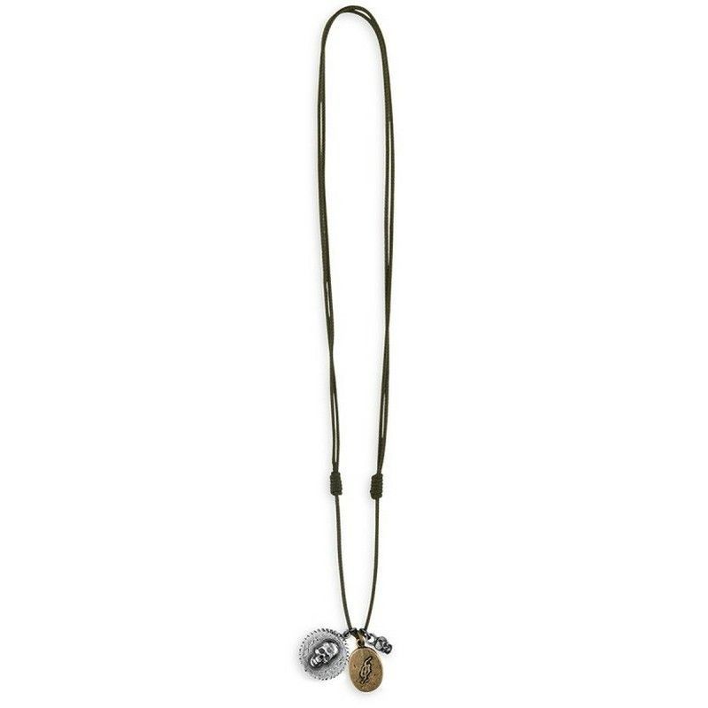 Colgante CAN12C con cadena de cuero verde y dijes en metal plateado y bronce, ideal para adultos que buscan un estilo bohemio y atrevido. Combina calaveras y medalla con acabado vintage. Perfecto como accesorio para looks casuales o alternativos.