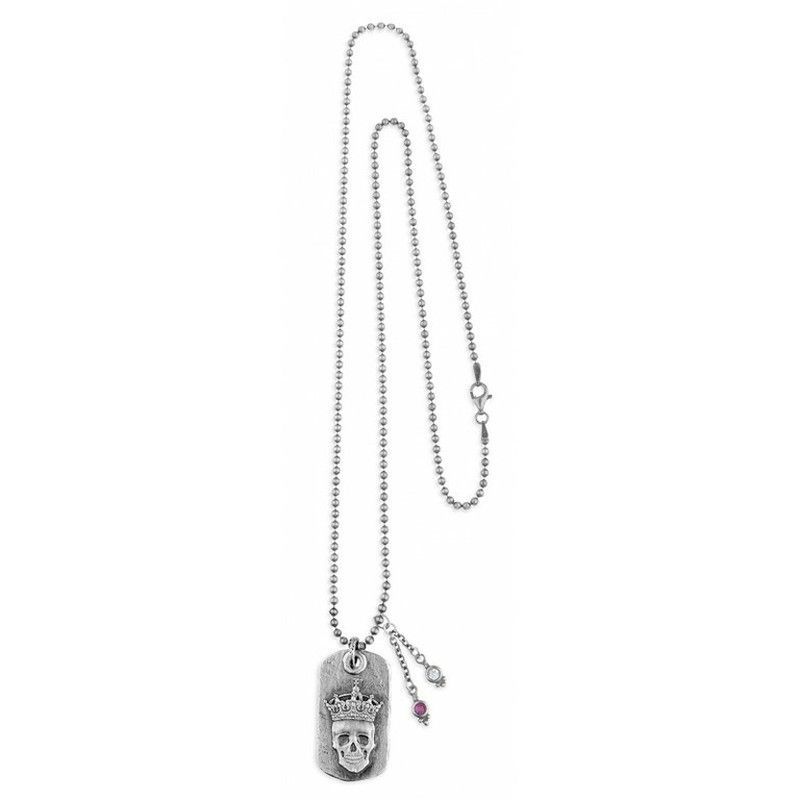 Colgante CAN20 en plata de ley con diseño de calavera coronada, ideal para amantes del estilo urbano y alternativo. Fabricado en metal con acabado mate y detalles en circonitas, incluye una pequeña piedra rosa colgante. Cadena de eslabones finos para un look sofisticado y atrevido. Perfecto como regalo o para completar tu look diario.