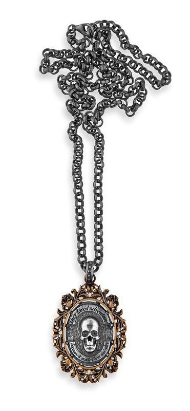 Colgante unisex CAN9 con diseño gótico y vintage, ideal para amantes de la joyería oscura y sofisticada. Fabricado en plata de ley y bronce, presenta una calavera central con inscripción en latín y marco barroco. Cadena de eslabones gruesos en acabado oscuro. Perfecto para usar diariamente o como pieza de declaración.