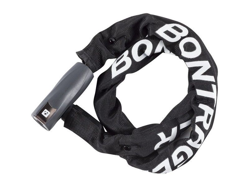 Candado Bontrager Pro para bicicletas, con cadena de acero inoxidable recubierta de textil negro con logo blanco. Ideal para ciclistas que buscan seguridad y estilo. Resistente al robo y al clima, fácil de usar y transportar. Protege tu bicicleta en cualquier lugar.