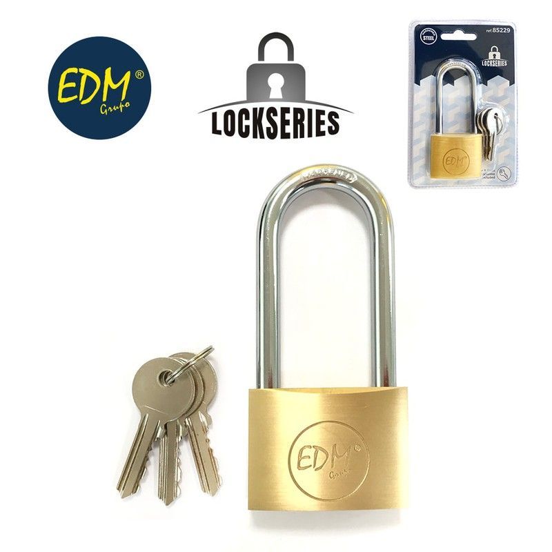 Candado de latón con arco largo de 40x65mm, ideal para asegurar puertas, cajas fuertes, bicicletas o equipaje. Fabricado en metal resistente con acabado dorado y arco de acero inoxidable plateado. Incluye llaves para mayor seguridad. Perfecto para uso en hogar, oficina o viajes. Alta calidad y durabilidad garantizada por EDM Grupo.