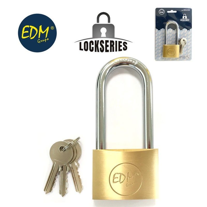 Candado de latón con arco largo de 50x80 mm, fabricado en acero inoxidable y metal de alta resistencia. Ideal para asegurar puertas, cajas fuertes, bicicletas o herramientas. Incluye llaves y diseño robusto con logotipo EDM Grabo. Perfecto para uso en exteriores y aplicaciones de seguridad diaria.
