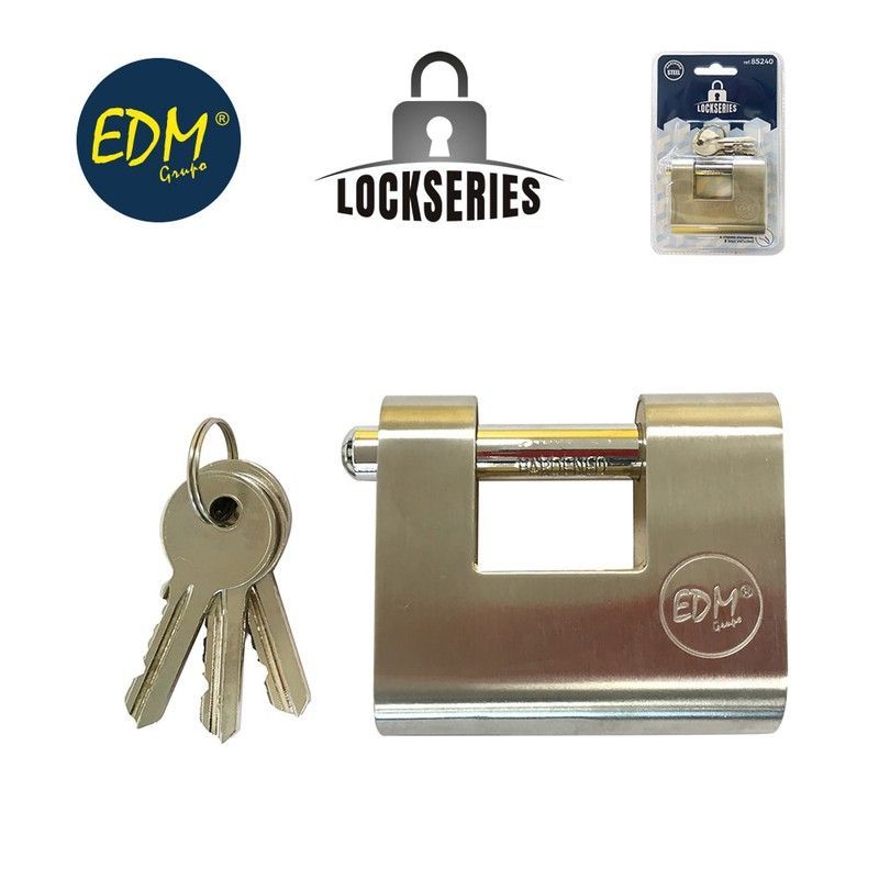 Candado de seguridad reforzado EDM Grupo, fabricado en metal resistente con acabado dorado y plateado. Ideal para cerrar puertas, cajas fuertes, maletas o herramientas. Incluye llaves de alta seguridad. Diseño robusto y duradero para uso en hogar, taller o industria. Protección confiable y fácil de usar.