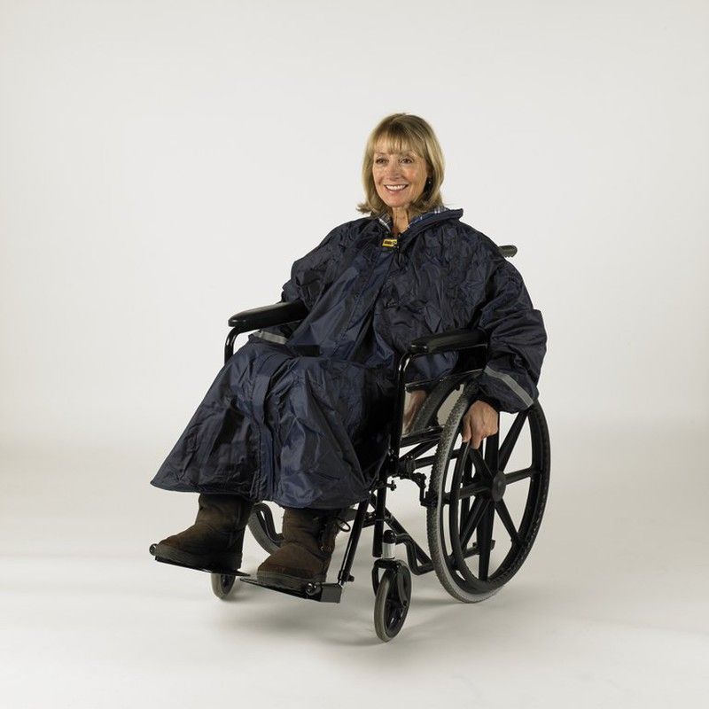 Capote splash con mangas para personas en silla de ruedas, fabricado en poliéster resistente al agua. Diseñado para ofrecer protección completa contra la lluvia y el viento, con ajuste en muñecas y cierre frontal. Ideal para adultos que buscan comodidad y movilidad en condiciones climáticas adversas. Incluye protección para los pies y se adapta per