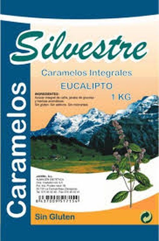 Caramelos integrales de eucalipto de la marca Silvestre, en presentación de 1 kg. Sin gluten, ideales para quienes buscan opciones naturales y saludables. Embalaje con diseño de paisaje montañoso y planta de eucalipto, destacando su origen natural y calidad. Perfectos para uso diario o como ingrediente en recetas caseras.