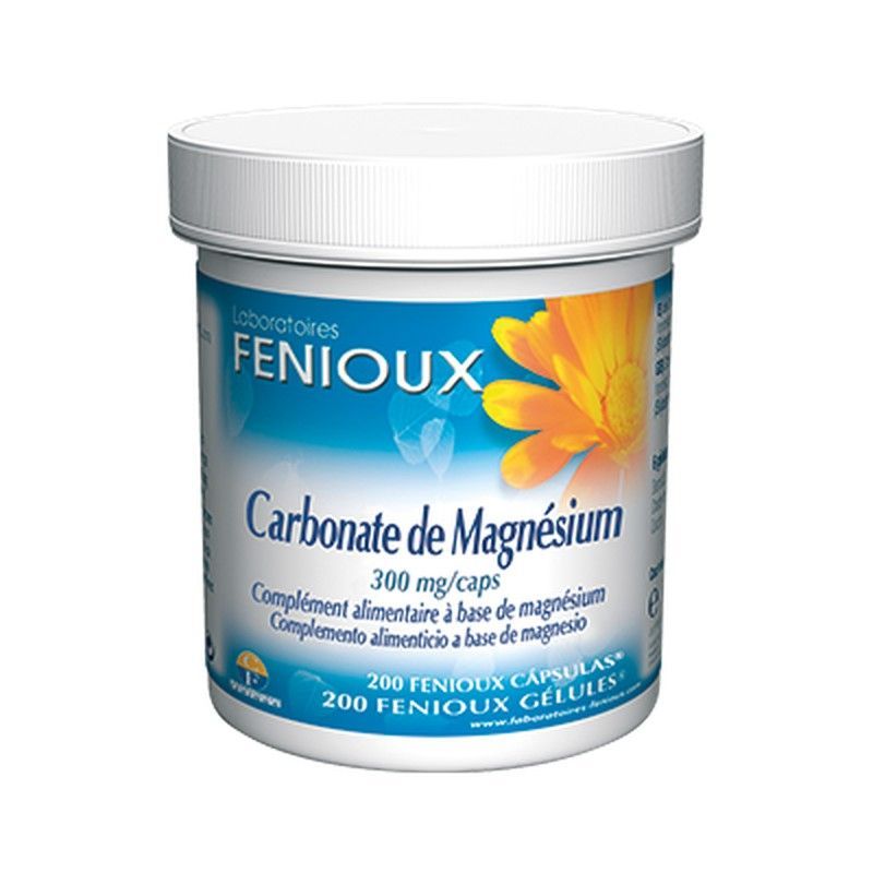 Carbonato de magnesio 300 mg en 200 cápsulas de Laboratoires FENIOUX. Complemento alimenticio ideal para mantener niveles adecuados de magnesio en el organismo. Fórmula de alta calidad, fácil de tomar y adecuada para adultos que buscan apoyo nutricional diario. Envase práctico y seguro.