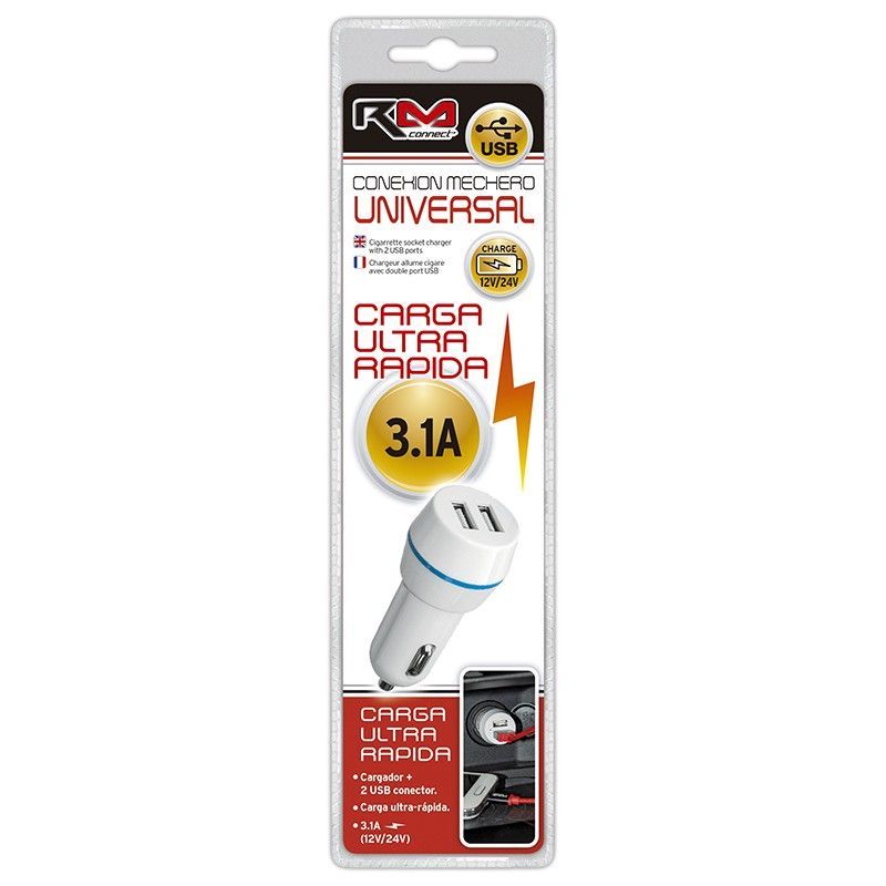 Cargador de mechero universal RM Connect con doble puerto USB para carga ultra-rápida de 3.1A. Ideal para móviles, tablets y otros dispositivos en coche o camión. Diseño compacto y seguro, compatible con sistemas de 12V y 24V. Empaquetado en blister transparente para protección y fácil visualización.