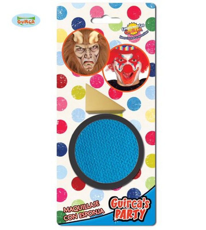 Maquillaje para carnaval con esponja azul cielo de Guirca, ideal para niños. Incluye stickers divertidos de payaso y hombre con cuernos. Perfecto para fiestas temáticas y disfraces infantiles. Fácil de usar y con diseño alegre y colorido.