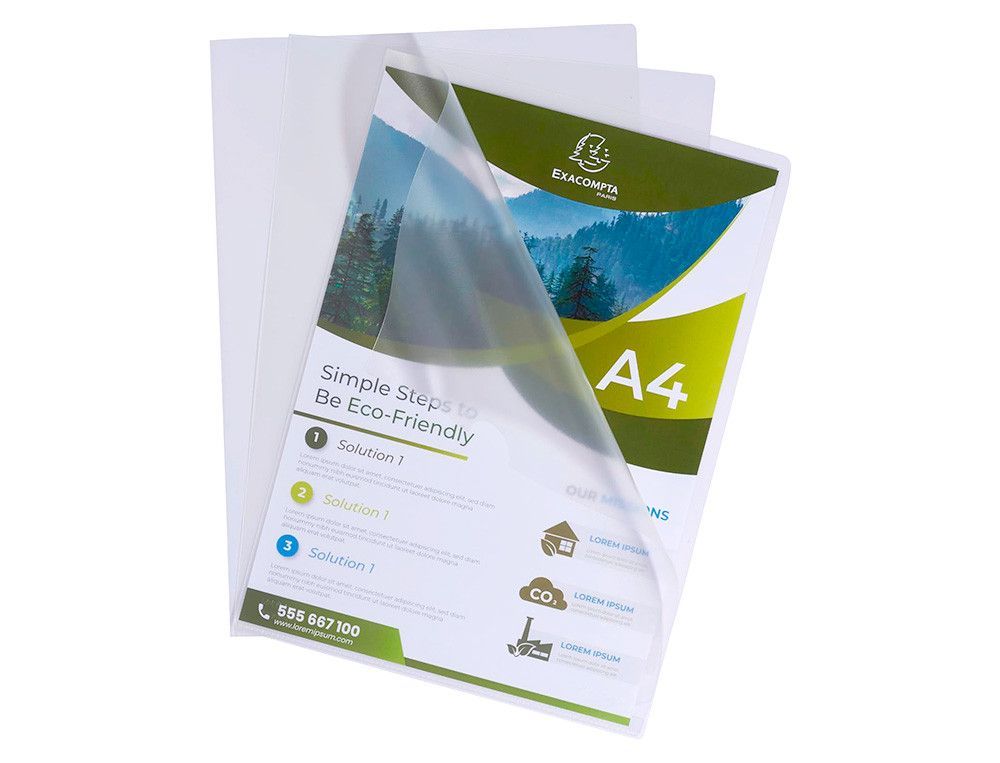 Carpeta dossier uñero Exacompta en polipropileno reciclado, formato A4, ideal para organizar documentos de oficina. Presentada en caja de 100 unidades, con diseño ecológico y ventana transparente para fácil identificación. Perfecta para uso diario en entornos profesionales y educativos.