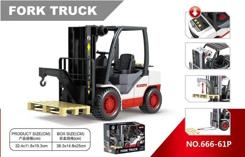 Carretilla elevadora de juguete de 32,4 cm con luces y sonidos, ideal para niños que disfrutan de vehículos industriales. Fabricada en plástico resistente, con diseño realista que incluye ruedas rojas, cabina con asiento y volante, y plataforma para paletas. Perfecta para juegos de imaginación y desarrollo motor en niños pequeños.