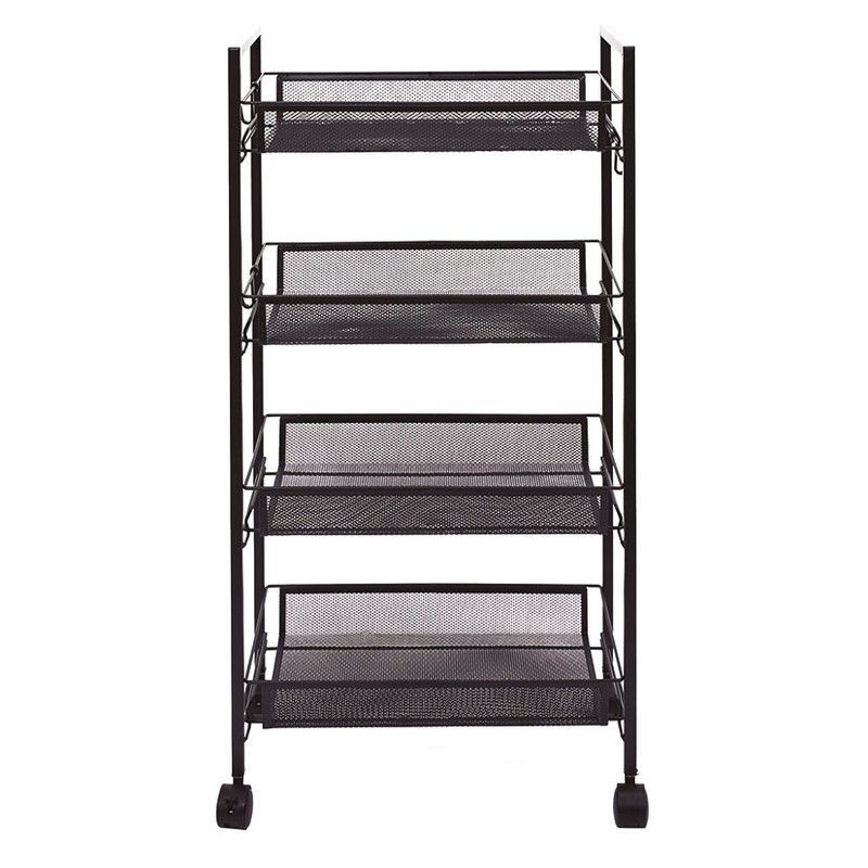 Carrito camarera con 4 alturas, fabricado en metal resistente y acabado en negro. Ideal para bares, restaurantes o espacios de servicio. Cuenta con rejillas metálicas en cada nivel para una organización óptima y ruedas para una fácil movilidad. Diseño funcional y duradero para uso diario en entornos profesionales.