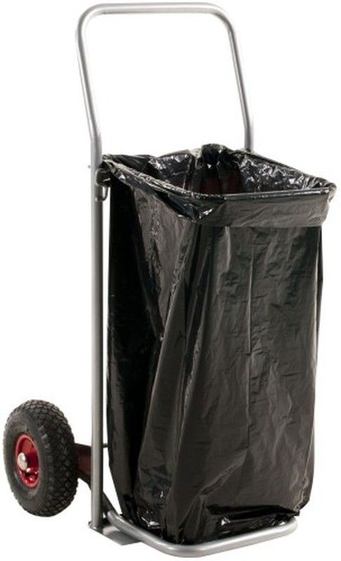 Carro bolsa basura de 125 litros con estructura de acero inoxidable y rueda con neumático para mayor movilidad. Ideal para uso doméstico o en espacios comerciales, permite transportar fácilmente bolsas de basura sin esfuerzo. Diseño robusto y práctico, con manillar ergonómico y capacidad para bolsas de plástico negras. Solución eficiente para la ge