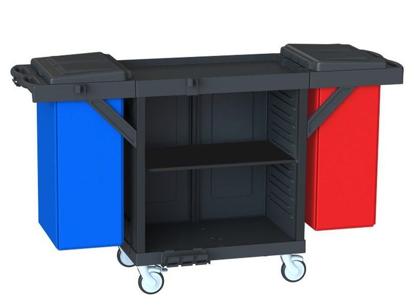 Carro para contenedores de residuos con baldas y dos compartimentos laterales en azul y rojo, ideal para jardines, terrazas o espacios de trabajo. Fabricado en plástico resistente, cuenta con ruedas para fácil movilidad y estantería central para organizar herramientas o productos. Solución práctica y ordenada para el manejo de residuos en el hogar