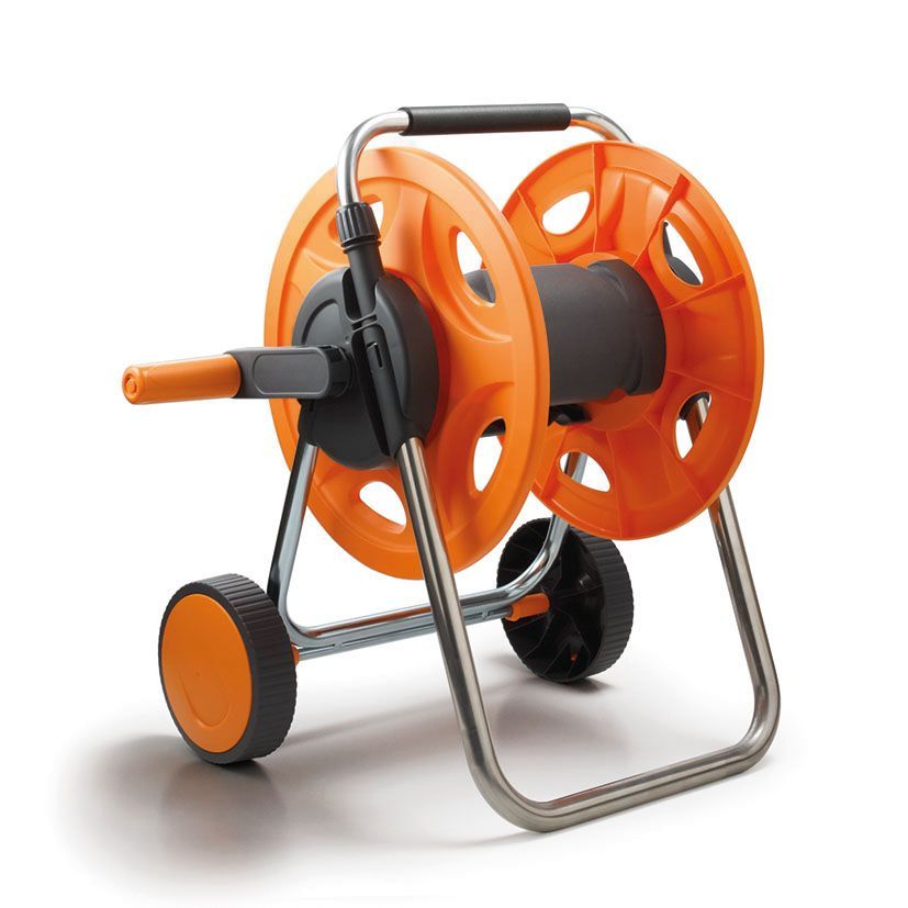 Carro portamanguera Water Cycle con estructura de acero inoxidable y bobina de plástico naranja, ideal para jardines y exteriores. Fácil de transportar gracias a sus ruedas y manija ergonómica. Organiza y protege tu manguera de jardín con estilo y funcionalidad.
