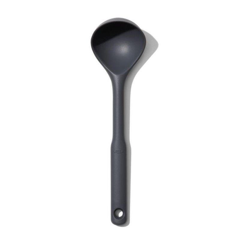 Cazo pequeño de silicona gris de OXO, ideal para cocinar y servir con precisión. Fabricado en silicona resistente al calor, es seguro para uso en ollas, sartenes y hornos. Su mango largo y diseño ergonómico facilitan el manejo y evitan quemaduras. Incluye orificio para colgar y almacenar fácilmente. Perfecto para cocineros que buscan herramientas d