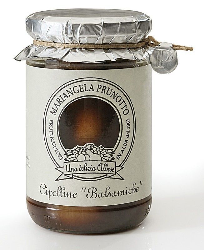Cebollitas en aceite balsámico de Módena de Mariangela Prunotto, en elegante frasco de vidrio con tapa metálica. Ideal para acompañar quesos, carnes o como aperitivo gourmet. Producto artesanal italiano con sabor intenso y aroma delicado. Perfecto para amantes de la cocina mediterránea y la alta gastronomía.