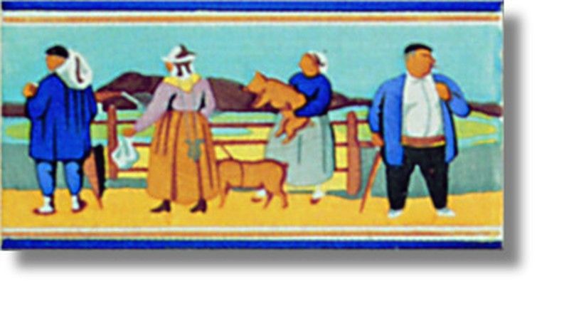 Cenefa cerámica de 10x20 cm con diseño artístico de escena rural, ideal para decorar baños, cocinas o espacios con estilo tradicional. Su estampado con figuras humanas y perros en trajes típicos aporta un toque cultural y artesanal a cualquier ambiente. Fabricada por Ceramica Lantiga, es resistente y fácil de limpiar, perfecta para proyectos de ref