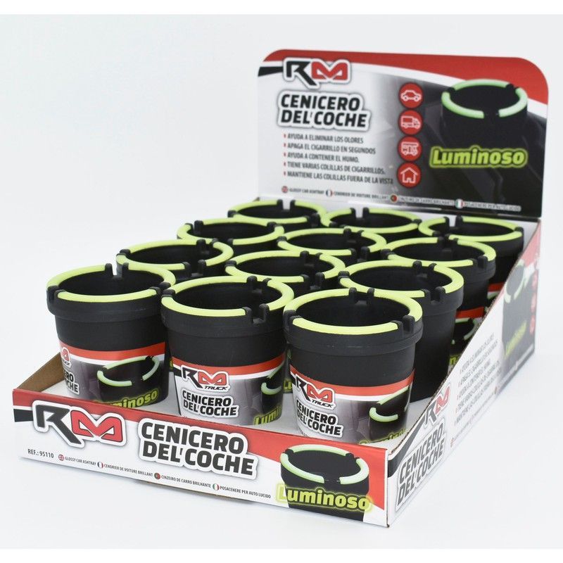 Cenicero reflectante RM para coche, ideal para conductores que buscan seguridad y estilo. Diseño negro con detalles luminosos en verde para mayor visibilidad en la oscuridad. Empaquetado en caja rectangular con múltiples unidades, perfecto para regalos o uso personal. Fácil de usar y mantener, con acabado resistente y funcional para el interior del