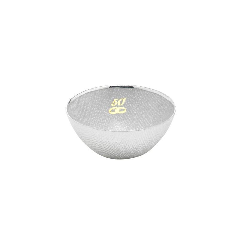 Centro de mesa conmemorativo de 16 cm ideal para celebrar 50 años de matrimonio. Fabricado en metal con acabado plateado y detalles dorados, presenta una superficie texturizada y elegante. Perfecto como regalo simbólico para aniversarios de oro, añade un toque sofisticado a cualquier mesa de celebración.