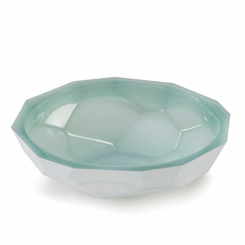 Centro de mesa de cristal en tonos azul claro y blanco, con diseño facetado que aporta elegancia y luz a cualquier espacio. Ideal para decorar mesas de comedor, salón o como pieza decorativa en estanterías. Su acabado brillante y formas geométricas lo convierten en un elemento sofisticado y versátil para interiores modernos.