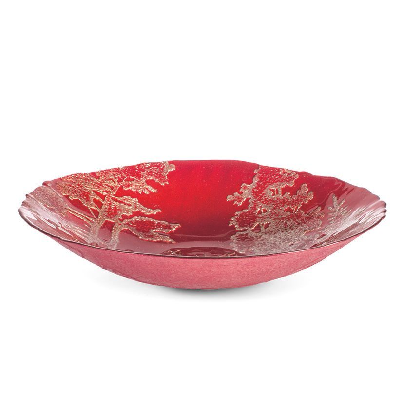 Centro de mesa Redwood de 30 cm en vidrio rojo con elegante diseño de árboles en relieve dorado. Ideal para decorar mesas de comedor o salón, aporta un toque sofisticado y natural. Su borde ondulado y acabado translúcido lo convierten en un elemento decorativo único. Perfecto para ocasiones especiales o uso diario.