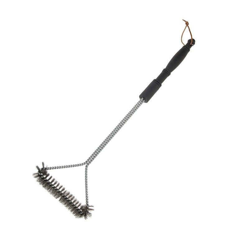Cepillo de barbacoa metálico con mango ergonómico en negro, fabricado en acero inoxidable para una limpieza eficaz y duradera. Ideal para mantener tus parrillas limpias y en perfecto estado. Cuerpo trenzado en forma de Y con cerdas resistentes y cuerda de suspensión para un almacenamiento cómodo. Perfecto para usuarios de barbacoas en casa o al air