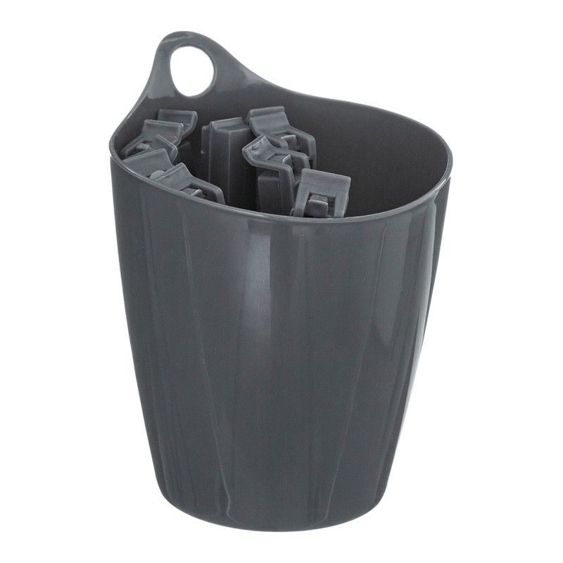 Cesta práctica de plástico gris con 25 pinzas para cocina, ideales para sujetar bolsas, envoltorios o utensilios. Diseño con asa integrada y surcos verticales para mayor resistencia. Perfecta para mantener la cocina organizada y con un toque funcional. Ideal para uso diario en hogares y cocinas.