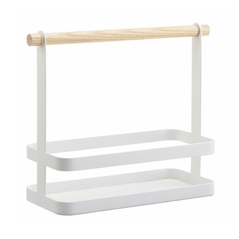 Cesta de condimentos Tosca en blanco y madera natural, ideal para organizar tu cocina con estilo. Fabricada en acero y madera, cuenta con dos estantes y una barra superior para colgar utensilios. Diseño minimalista y funcional, perfecta para mantener tus especias y accesorios de cocina ordenados y a mano.