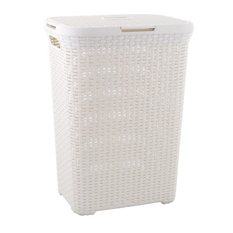 Cesto con tapa Natural Style de 40 litros en color blanco, fabricado en plástico con diseño trenzado imitación mimbre. Ideal para organizar la ropa sucia o guardar textiles en el hogar. Con asas laterales para un transporte fácil y base antideslizante. Perfecto para baños, dormitorios o espacios de almacenaje.