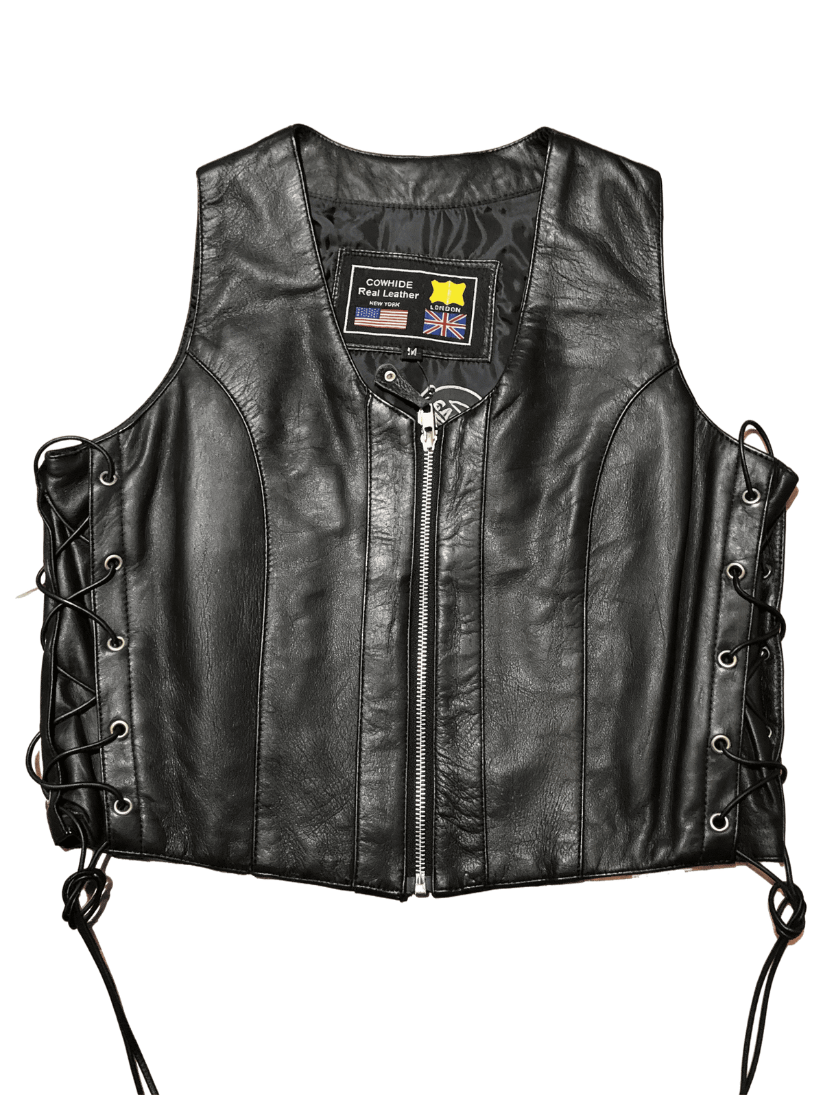 Chaleco con cremallera frontal metálicaLazos laterales con ojales metálicosEtiqueta con banderas de estados unidos y reino unido en la parte traseraDiseño ajustado con costuras verticales