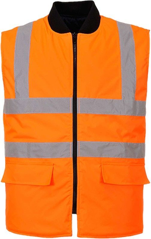 Chaleco de calor reversible de alta visibilidad en color naranja, ideal para trabajos en exteriores o condiciones climáticas frías. Con bandas reflectantes grises para mayor seguridad y visibilidad. Fabricado en poliéster y algodón, cuenta con cierre frontal de cremallera y bolsillos frontales con solapa. Diseño funcional y resistente, perfecto par