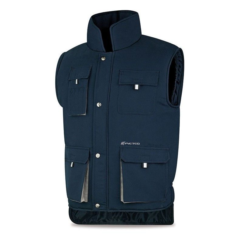 Chaleco multibol Heimdall en color azul marino, ideal para trabajos de bricolaje y herramientas. Confeccionado en poliéster y lona resistente, cuenta con cuello alto, cierre con botones metálicos y cuatro bolsillos exteriores con solapa y cierre de presión. Diseño funcional y duradero, perfecto para profesionales que necesitan llevar herramientas d