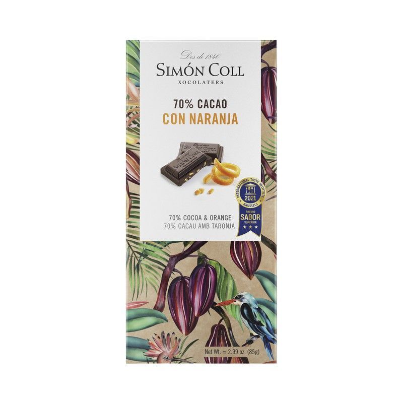 Chocolate 70% cacao con naranja de Simón Coll, en elegante caja rectangular con diseño tropical. Ideal para amantes del chocolate oscuro con toque cítrico. Premiado en 2021 por su sabor excepcional. Perfecto para disfrutar puro o en repostería. Peso neto: 85g.