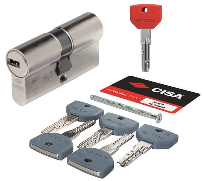 Cilindro de seguridad ASIX P8 con protección anti-taladro y anti-bumping, acabado niquelado, dimensiones 45x50 mm. Incluye llaves con cabezales de plástico gris y una llave maestra roja. Ideal para puertas de interior y exterior, garantiza alta seguridad y durabilidad. Fabricado en acero inoxidable para resistencia al desgaste y a la corrosión.