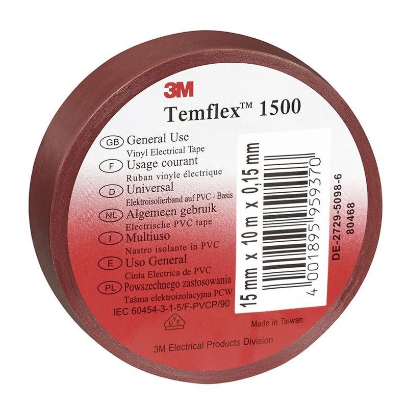 Cinta aislante 3M Temflex 1500 de color marrón, fabricada en PVC de alta calidad, ideal para uso general en aplicaciones eléctricas. Con dimensiones de 15 mm de ancho y 10 metros de largo, ofrece excelente resistencia y adherencia. Perfecta para aislamiento de cables y conexiones eléctricas en entornos industriales y domésticos. Fabricada en Taiwán