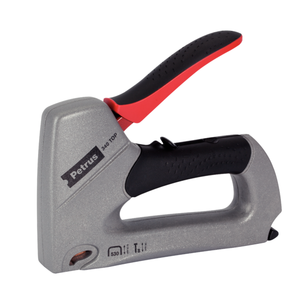 Clavadora Taurus modelo 340 Top, ideal para oficinas y trabajos manuales. Fabricada en metal y plástico resistente, con manijas ergonómicas en negro y rojo para un agarre cómodo. Compatible con grapas de 530 de 4 a 14 mm y pins de 8/15 mm. Diseño compacto y duradero para uso frecuente.