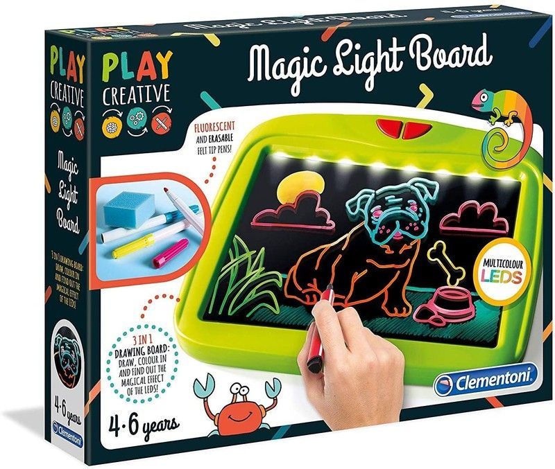 Pizarra luminosa Magic Light Board de Clementoni para niños de 4 a 6 años. Juego creativo con lápices fluorescentes y borrador, que permite dibujar, colorear y disfrutar del efecto mágico de los LEDs multicolor. Ideal para desarrollar la creatividad y la motricidad fina en un entorno divertido y seguro.