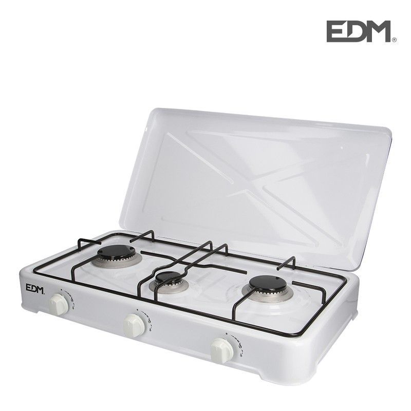 Cocina de gas portátil EDM con 3 quemadores, ideal para uso en exteriores, camping o terrazas. Diseño compacto y práctico con tapas protectoras blancas y rejillas de metal. Fabricada en plástico resistente y componentes metálicos. Fácil de transportar y usar en cualquier lugar. Perfecta para cocinar al aire libre con comodidad y seguridad.
