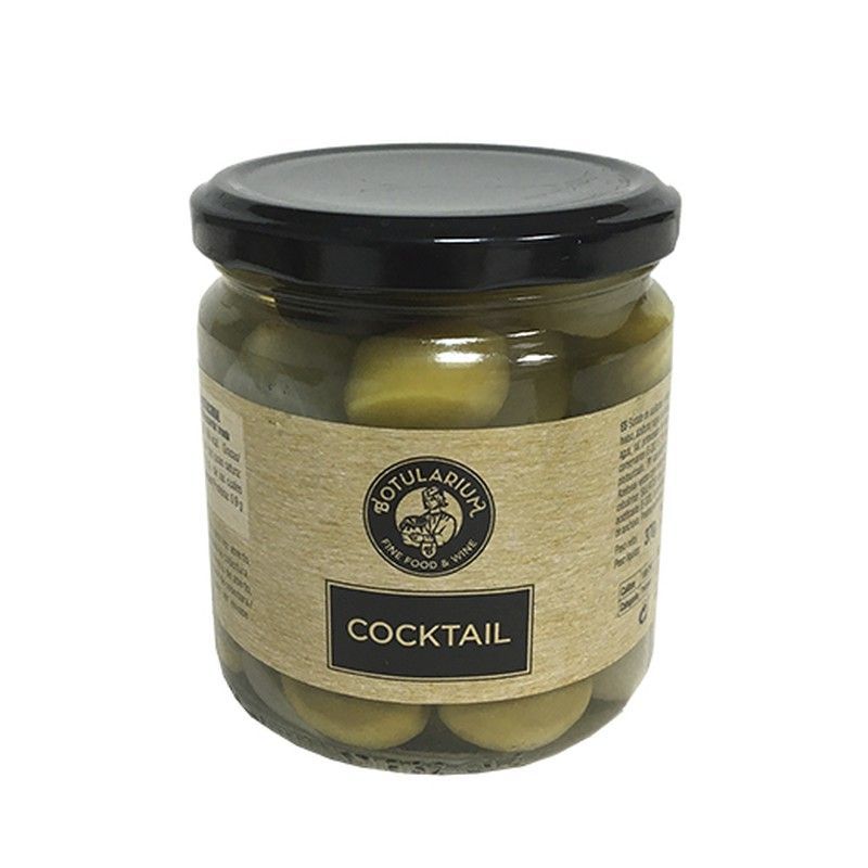 Aceitunas cocktail en bote de 370 ml de la marca Botularium, ideales para acompañar aperitivos, tapas o como ingrediente en recetas gourmet. Presentadas en un envase de vidrio con etiqueta rústica y tapa negra, estas aceitunas verdes ofrecen un sabor equilibrado y una textura suave. Perfectas para disfrutar en cualquier ocasión, ya sea como snack o