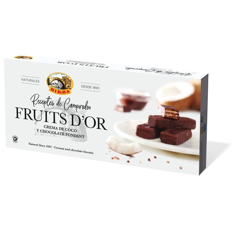 Galletas Birba Fruits d'Or con crema de coco y chocolate fondant, en caja de 145g. Recetas tradicionales desde 1893, con un sabor exquisito y textura cremosa. Ideal para disfrutar como tentempié o regalo gourmet. Embalaje elegante con diseño de productos naturales.