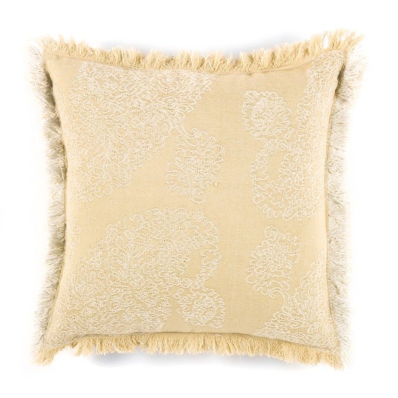 Cojín de algodón beige con estampado floral sutil y borlas en los bordes, ideal para decorar sofás, camas o rincones de lectura. Su textura suave y diseño elegante aportan un toque cálido y sofisticado a cualquier espacio. Perfecto para amantes de la decoración boho-chic o escandinava.