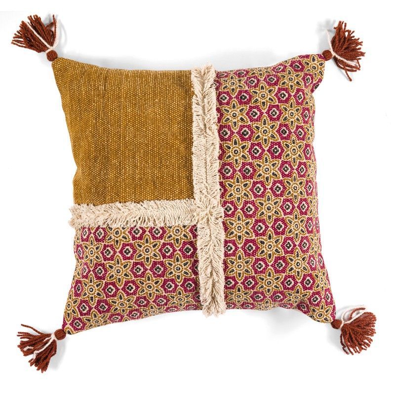 Cojín de algodón multicolor con diseño patchwork, ideal para decorar sofás, camas o rincones de estilo bohemio. Combina paneles lisos y estampados geométricos en tonos marrón, rojo y dorado, con detalles de flecos y borlas en cada esquina. Su textura y acabado artesanal aportan calidez y personalidad a cualquier espacio. Medidas: 45 x 45 x 10 cm.