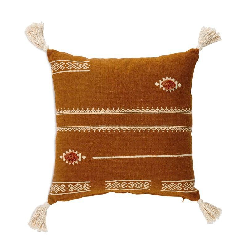 Cojín de algodón terracota de 45 x 45 cm con diseño étnico y bordados geométricos en blanco y rojo. Ideal para decorar sofás, camas o rincones de estilo bohemio. Incluye flecos blancos en cada esquina para un toque artesanal. Calidad duradera y textura natural que aporta calidez a cualquier espacio.