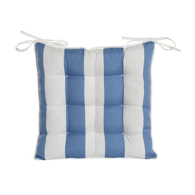 Cojín de asiento cuadrado con diseño de rayas verticales en azul celeste y blanco, ideal para sillas de jardín o terraza. Fabricado en algodón y poliéster, ofrece comodidad y estilo. Incluye cintas para fijarlo fácilmente. Perfecto para decorar y aportar confort a tu espacio exterior.