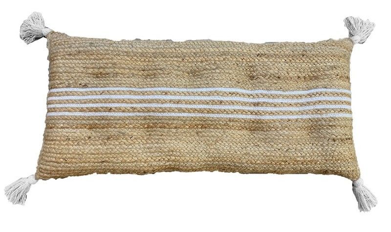 Cojín de banco en yute con rayas blancas de algodón, ideal para decorar sofás, bancos o sillas. Con acabado rústico y elegante, incluye borlas blancas en las esquinas. Mide 90x40 cm y aporta un toque bohemio y natural a tu hogar. Perfecto para espacios de estilo escandinavo, mediterráneo o boho-chic.