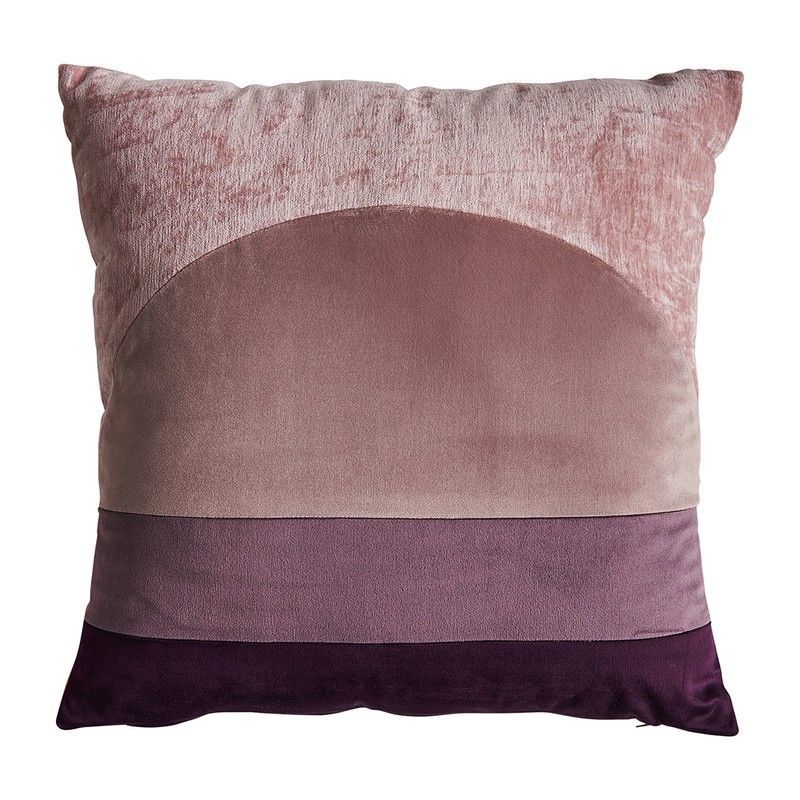 Cojín de terciopelo multicolor con diseño colorblock en tonos rosa, morado y violeta. Ideal para decorar sofás, camas o rincones de lectura. Su textura suave y acolchada aporta comodidad y estilo a cualquier espacio. Perfecto para amantes de la decoración moderna y cálida.