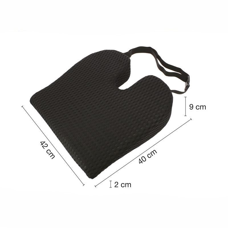 Cojín de espuma ergonómico de 42 x 40 x 9 cm, ideal para mejorar la postura en vehículos motorizados. Con textura de malla transpirable y cinta de amarre para fijarlo al asiento. Diseñado para aliviar la presión en la zona lumbar y cadera, perfecto para conductores y pasajeros que buscan comodidad durante largos trayectos. Fácil de limpiar y resist