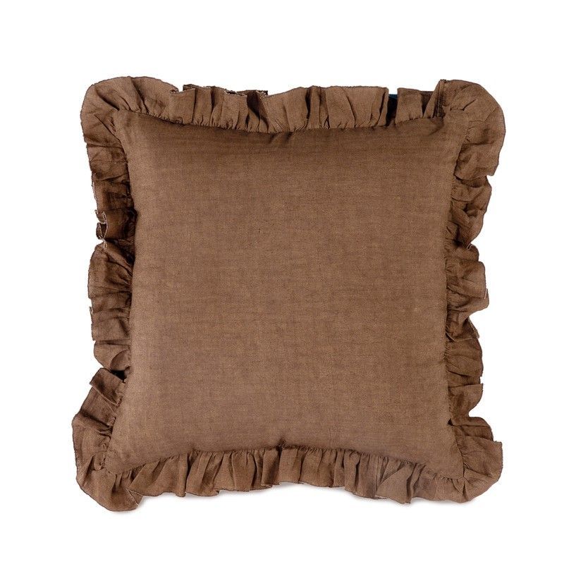 Cojín decorativo de lino y algodón en tono marrón cacao, ideal para añadir un toque rústico y acogedor a tu hogar. Con bordes con volantes, su diseño elegante y textura natural lo convierten en un complemento perfecto para sofás, camas o sillones. Dimensiones: 45 x 45 x 10 cm. Perfecto para decorar espacios en estilo campestre o escandinavo.
