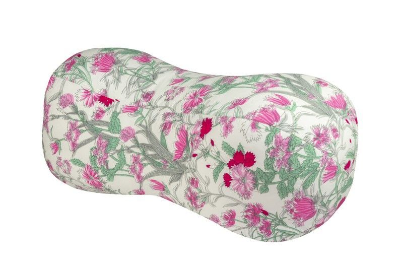 Cojín de playa Alegra Cacahuete Beach con estampado floral en tonos rosa y verde sobre fondo blanco. Fabricado en algodón y poliéster, ofrece comodidad y estilo para relajarte en la playa, el jardín o en casa. Ideal para quienes buscan un toque decorativo y funcional en sus espacios de descanso.